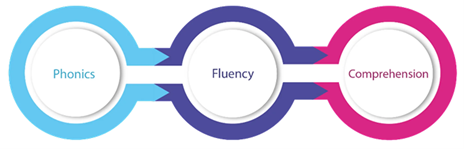 We also recognise the crucial role of reading fluency in this process. As Tim Rasinski describes (see diagram below), fluency—the ability to read with accuracy, appropriate rate, and expression—serves as the bridge between decoding and comprehension.