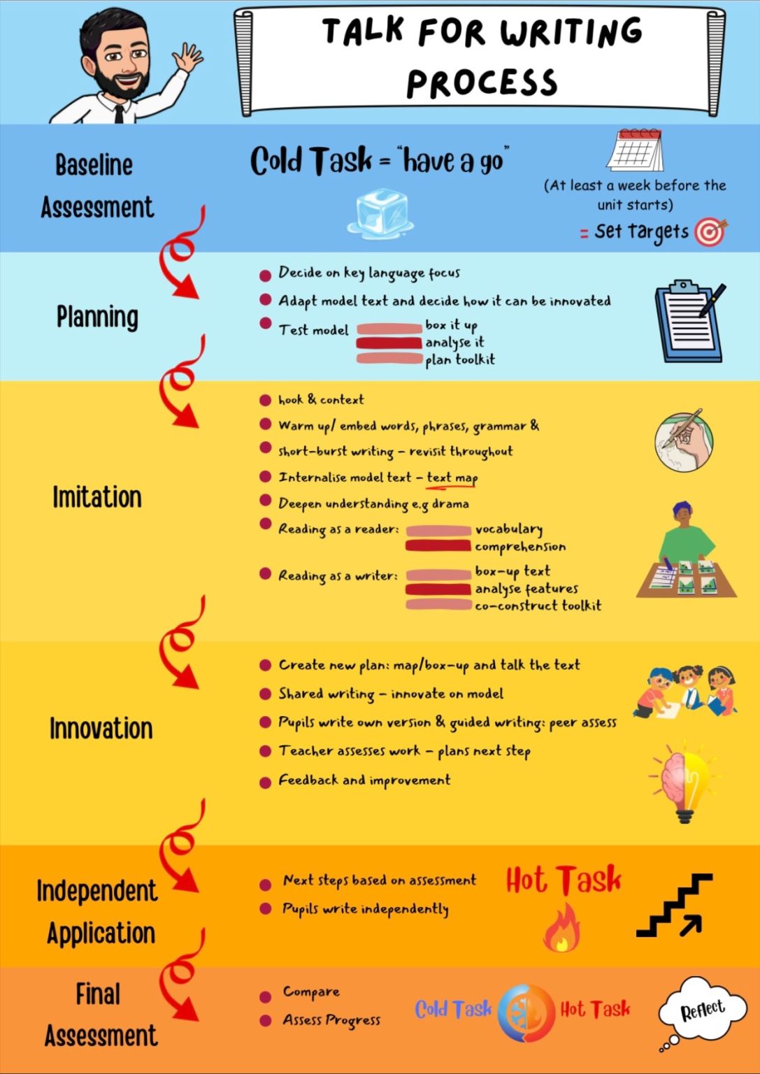 To support writing development, we follow the Talk for Writing (TfW) approach throughout the school. This structured and cumulative method helps children build confidence in both reading and writing. Through techniques like ‘talking the text’ and close reading, pupils internalise language patterns that improve their understanding and composition. The process moves from guided practice to independent writing, enabling pupils to write creatively, purposefully and with increasing confidence across different subjects and audiences.